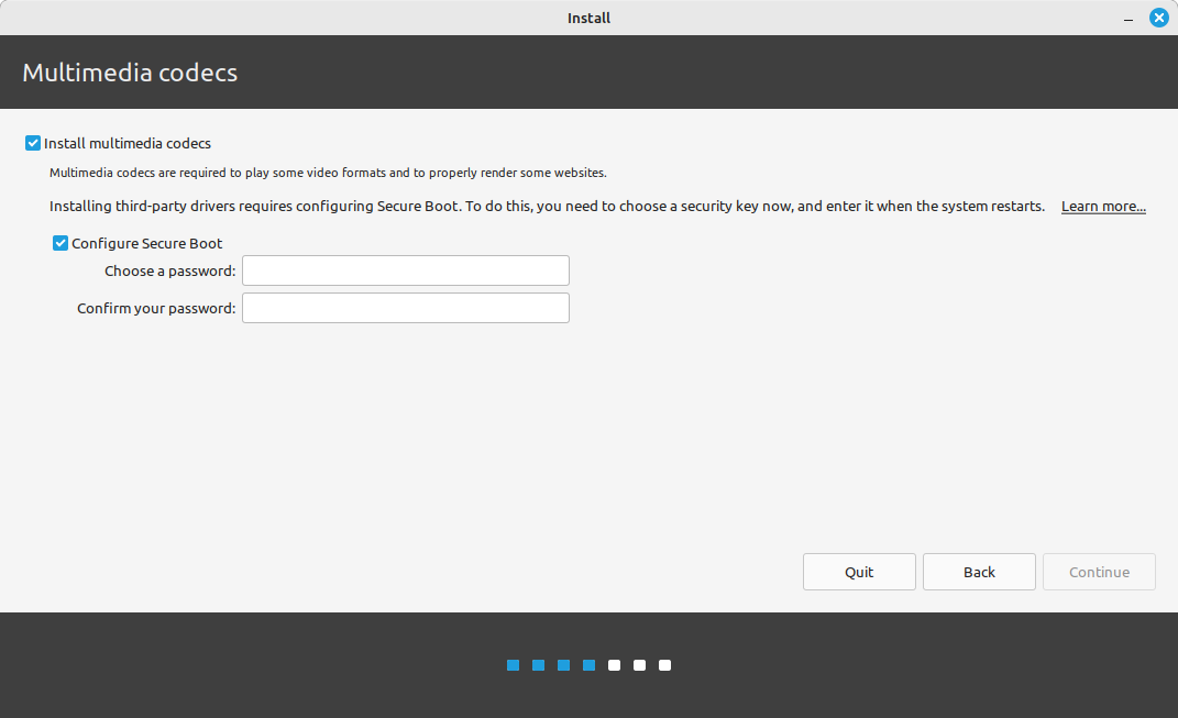 The first two screens were easy, the third one may need some input. This screen asks you if you want multi-media codecs installed. As a person who wants to watch video and listen to audio from services and such on Linux, you will need to check this box. However, that brings us to the question of "secure boot." If you haven't disabled secure boot in BIOS you're going to be prompted for a validation password that will be necessary next time you boot the computer. So make sure, if shown, that check-box is checked as well. Then, create a one-time-use password that you'll type in twice to verify you typed it correctly (and write it down, if you goof it up you get to do this whole install all over again). You will only use this password once, so use your own judgement on how strong it is. Once you've created a password, continue. It may take a few moments to process this for you, do not be alarmed.