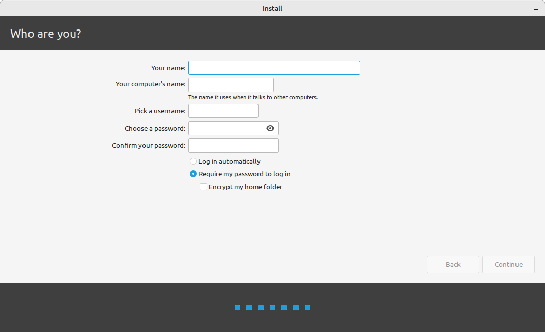 This is the last input you need to provide, here on screen 6. You can do as you like for all the other entries, but I recommend that you do NOT choose "log in automatically." That's just poor cybersecurity. Choosing to encrypt the home folders is a good balance between personal privacy and security along with performance - encrypting the whole disk can degrade performance, and your personal files will live in your home directory anyway. Hit continue, and you'll have the joy of watching Linux Mint install on your computer.