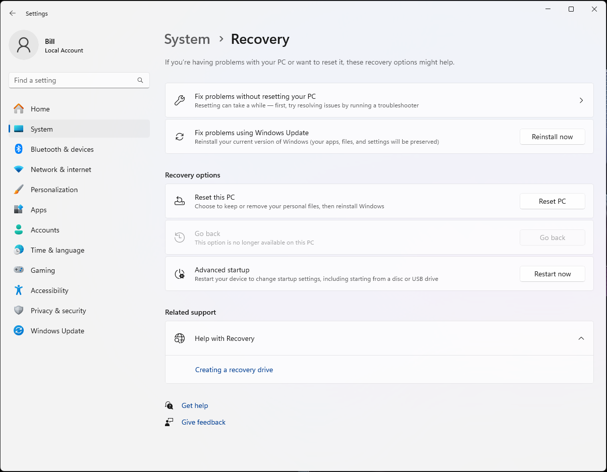 - In the "Settings" App search for "Advanced startup" which should bring you to the System/Recovery window. Hit the "Restart now" button where Advanced startup is on the right side.