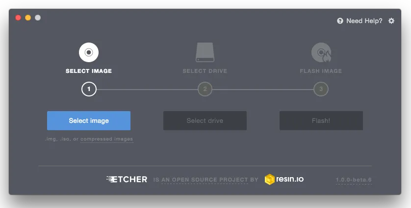 Install Etcher by double-clicking the downloaded installer and installing like you would any other executable. Once installed, plug in your USB thumb drive to become the install media and run the app and you should see an interface like this: