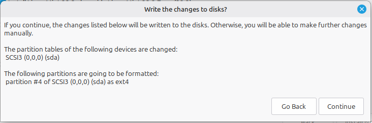 This warning will pop up as soon as you hit continue on that previous screen. The list of partitions may be different, but hitting continue here really gets things moving. Then we get to screen five and six.