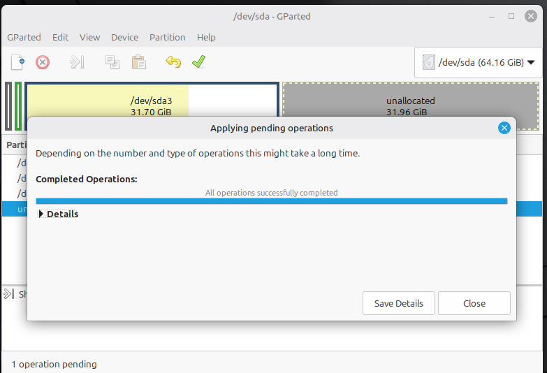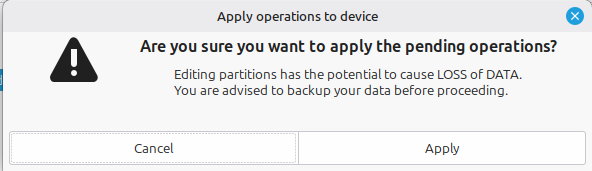 - You'll now see that there's an "unallocated" space shown in the graphic and in the list of partitions on your drive. This is perfect, our Linux install will take advantage of this free space. However, before it can do that we have to execute the change we just made. Hit the green ✔️ button on the toolbar at the top to execute the change. You'll be asked to confirm the change: