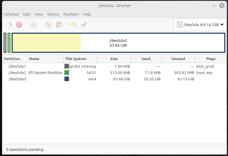 - The "GNOME Partition Editor" will open and will show you a graphical representation of your hard drive's partitions and used space. It will look something like this: