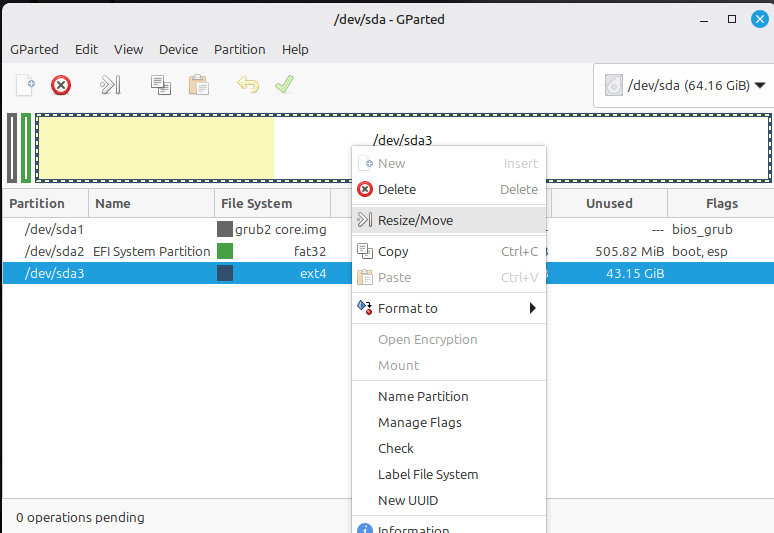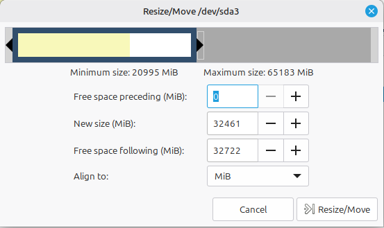 Once you've decided, resize your partition and hit the "Resize/Move" button.