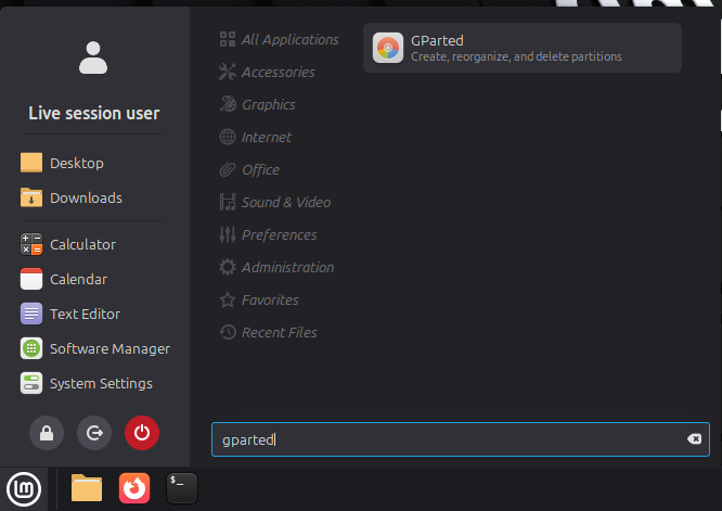 - Open the start menu (the circle with "LM" in it in the lower left) and start typing "gparted" in the search box. Click on the app that shows up