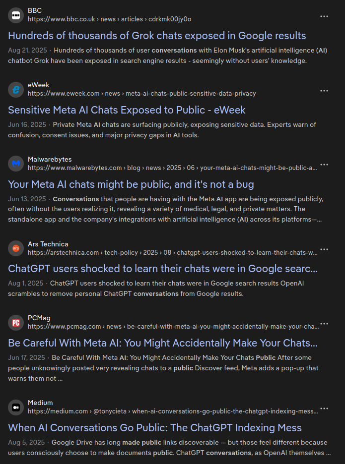 But that's OK because my assistant/Gen AI conversations are private, right? In a word, NO. They certainly should be, but let's not kid ourselves, the EULA you didn't read makes it pretty clear that anything you share with that system is, well, available for the owners of that system to use for a wide variety of purposes. And even if that wasn't the case, go do a quick web search for "AI conversations in search" and switch to the "news" filter. You'll see something like this come back: